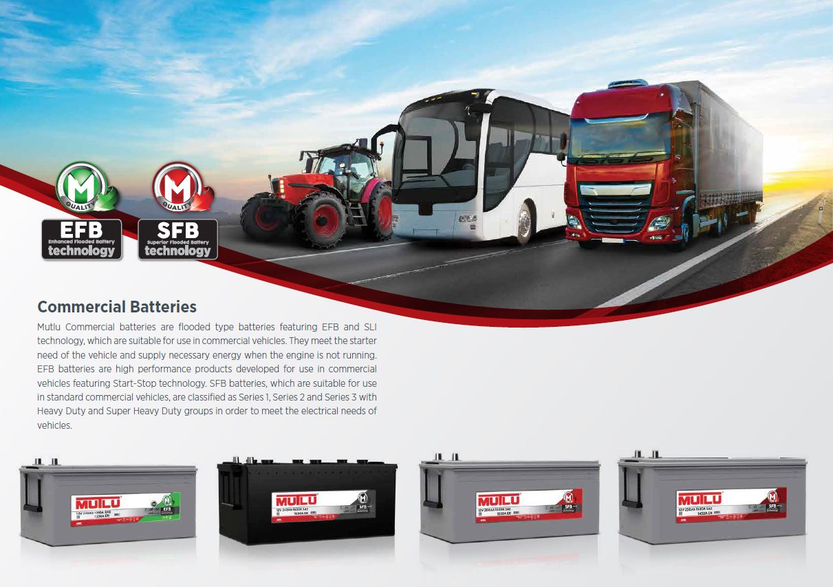 Mutlu Heavy Commercial Vehicle Batteries are designed for use in heavy commercial vehicle categories such as trucks, lorries, buses, construction equipment, tractors, agricultural and military vehicles. Mutlu Batteries provide power for heavy commercial vehicles to continue operation without interruption and reduce their performance in difficult roads, terrain, and climate conditions.